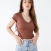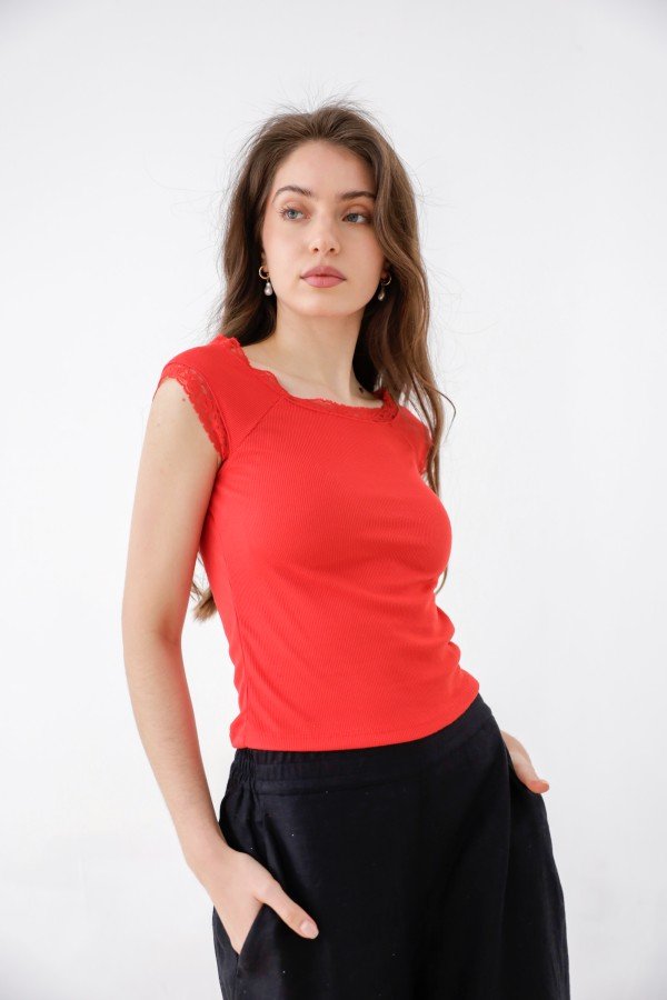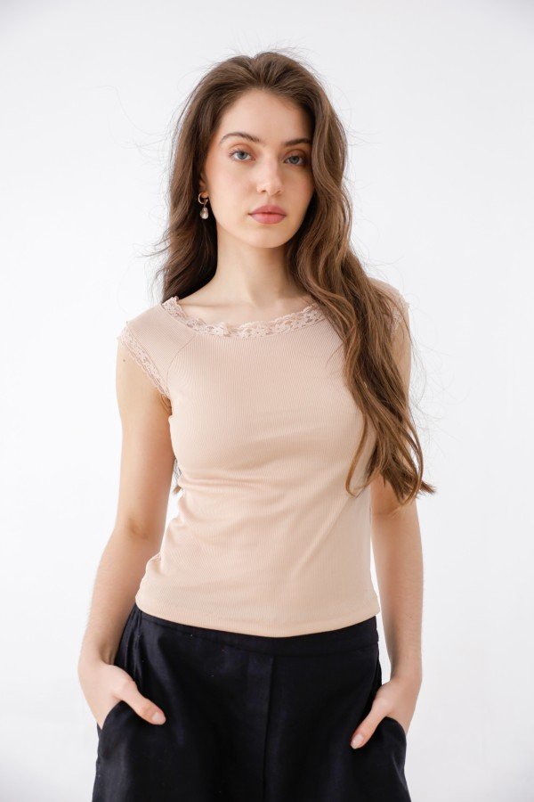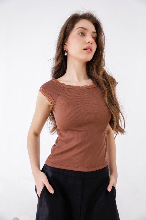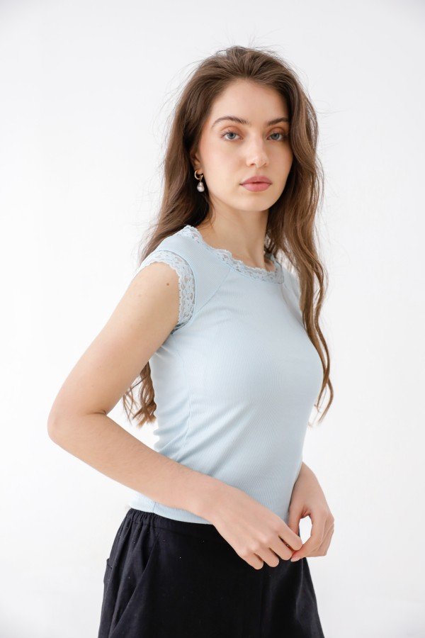 REMERA MANGA CORTA CON PUNTILLA AL TONO EN CUELLO Y MANGAS MORLEY SOFT