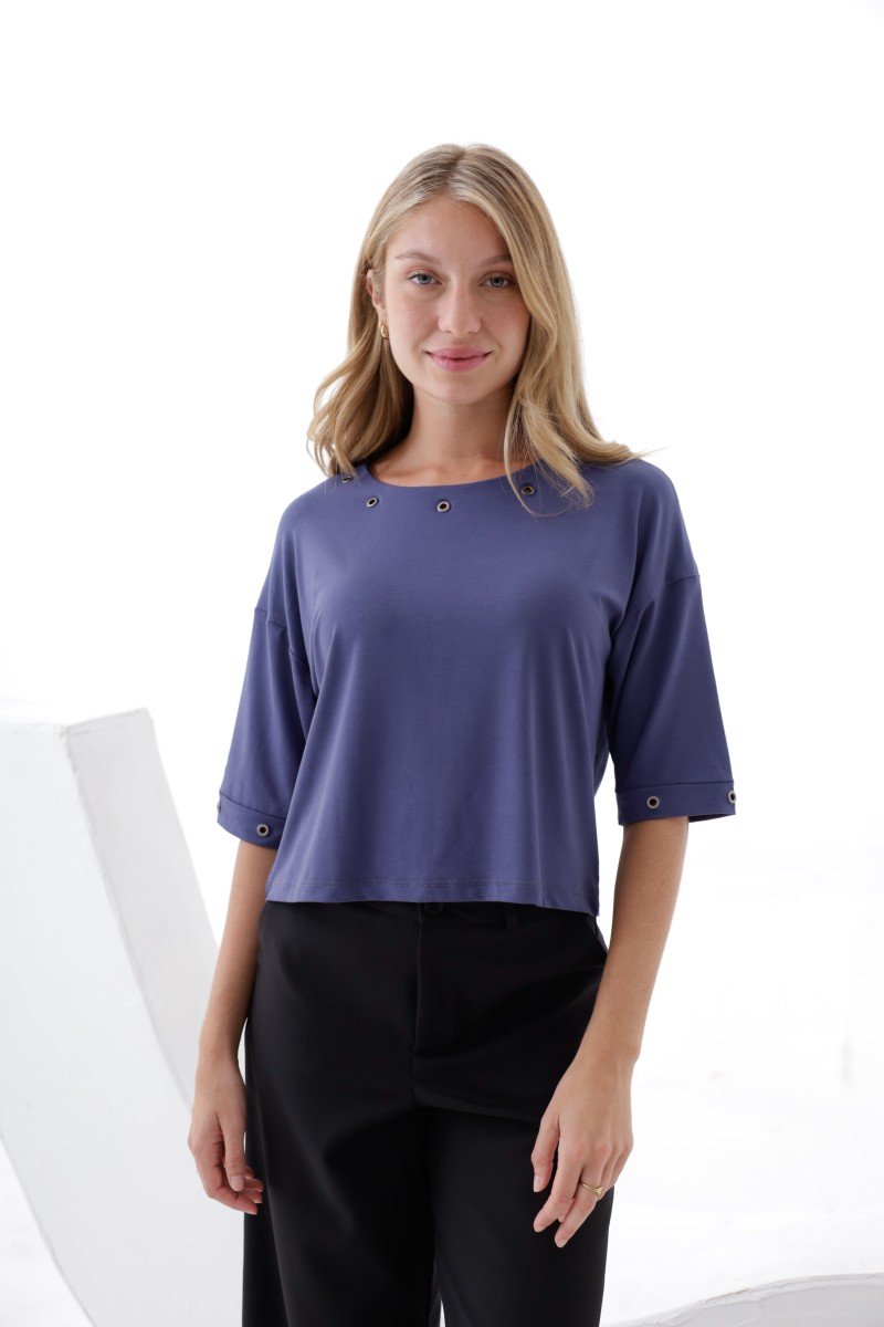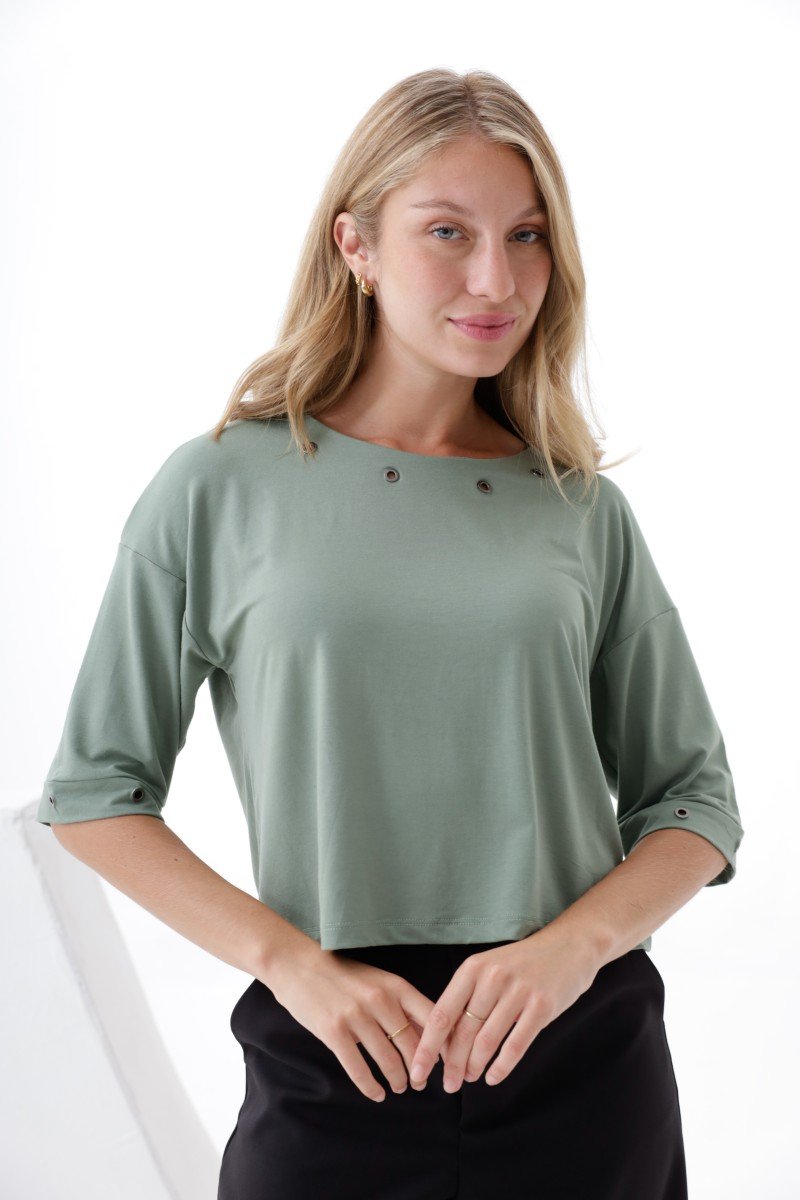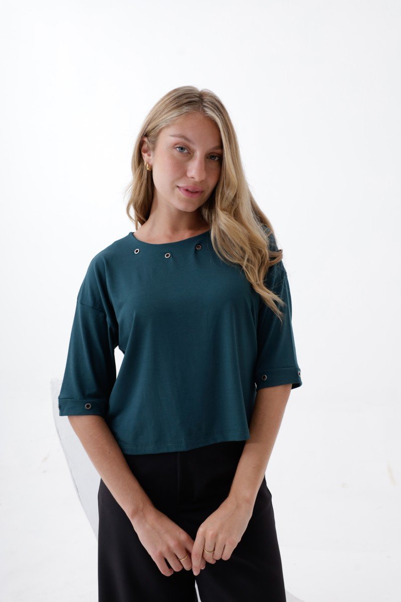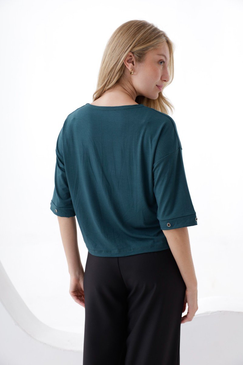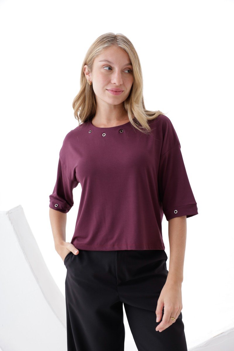 REMERA MANGA AL CODO DETALLE OJALILLO BRONCE EN CUELLO Y MANGAS MODAL VISCOSA